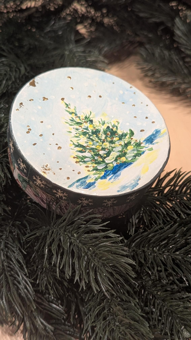 Boîte en carton peinte à la main. Peinture Acrylique, feuille d'or imitation, papier.