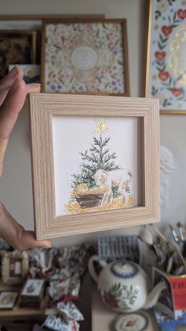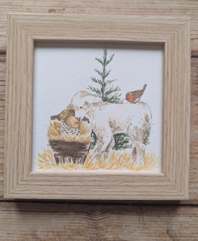 Aquarelle vendue encadrée représentant un petit agneau regardant l'enfant Jésus endormi.
