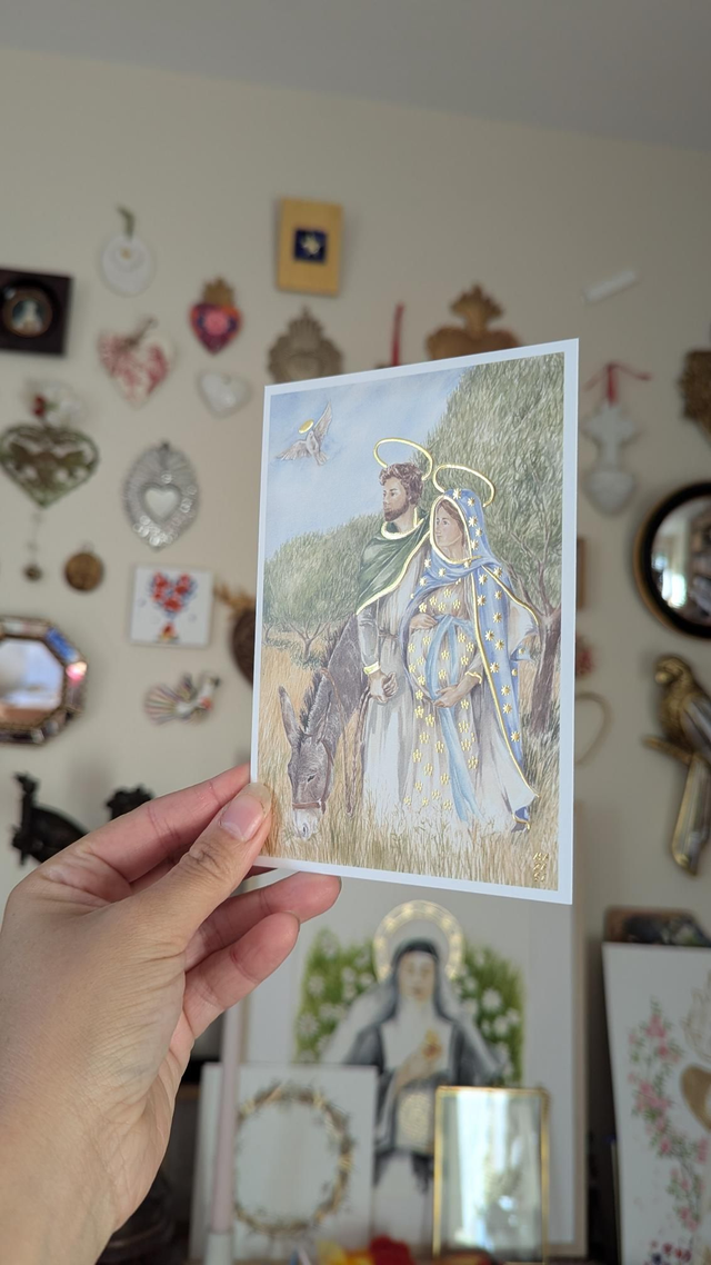 Reproduction au format carte postale, de l'aquarelle originale, représentant la Ste Famille qui s'apprête à base rendre à Bethléem, dans un champ d'olivier.