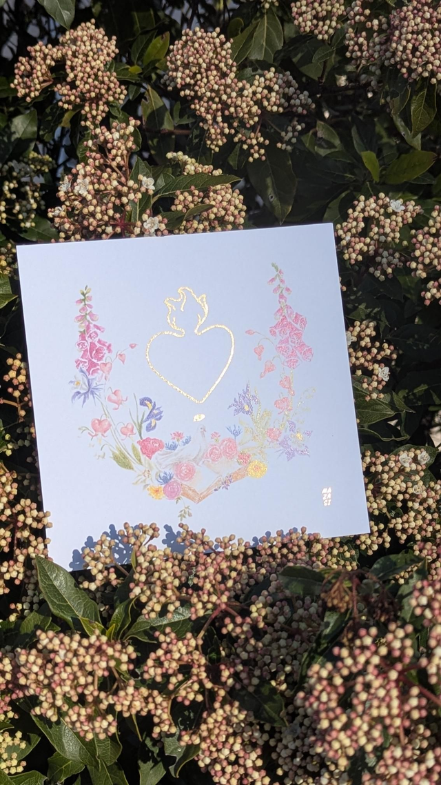 Carte carrée double avec la reproduction de mon aquarelle originale, sur le thème des fleurs traditionnellement rattachées à La Vierge Marie.