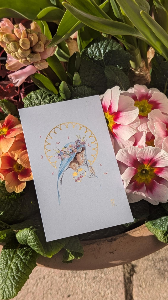 Carte reproduction d'après mon aquarelle originale, représentant une Vierge à l'Enfant couronnée de fleurs de printemps.