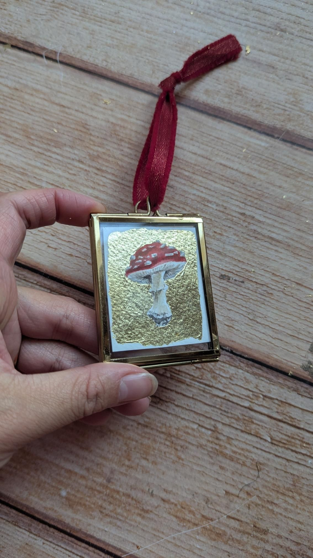 Petite aquarelle représentant une amanite tue mouche , sur fond d'or, encadrée dans son petit cadre entre deux verres.
