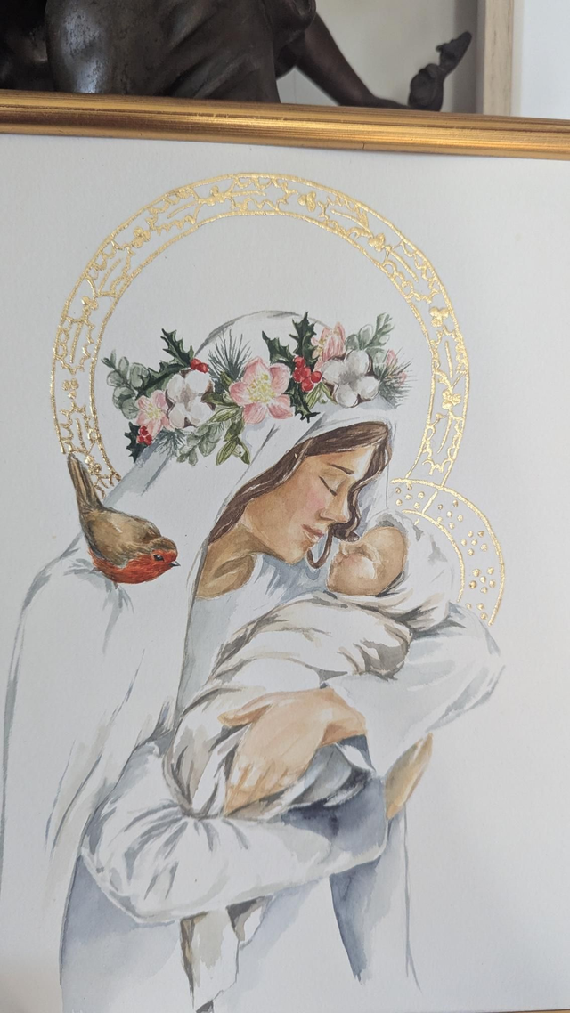 Aquarelle originale unique , représentant la Sainte Vierge , couronnée de végétaux de Noël. L'auréole est ornée de houx.